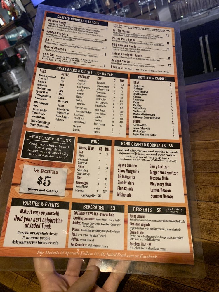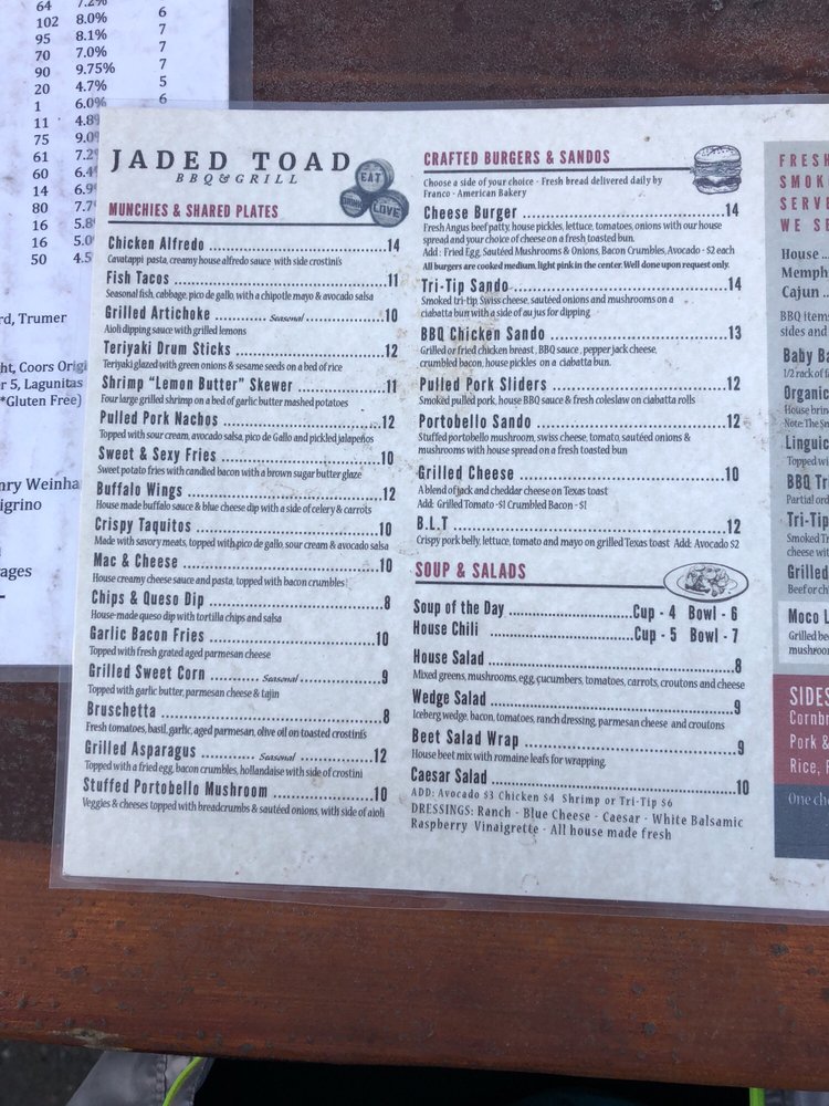 Whether you're here for a casual lunch, lively dinner, or a celebration, the menu at Jaded Toad BBQ & Grill is crafted to satisfy all cravings. Come and indulge in a feast that balances tradition and innovation!